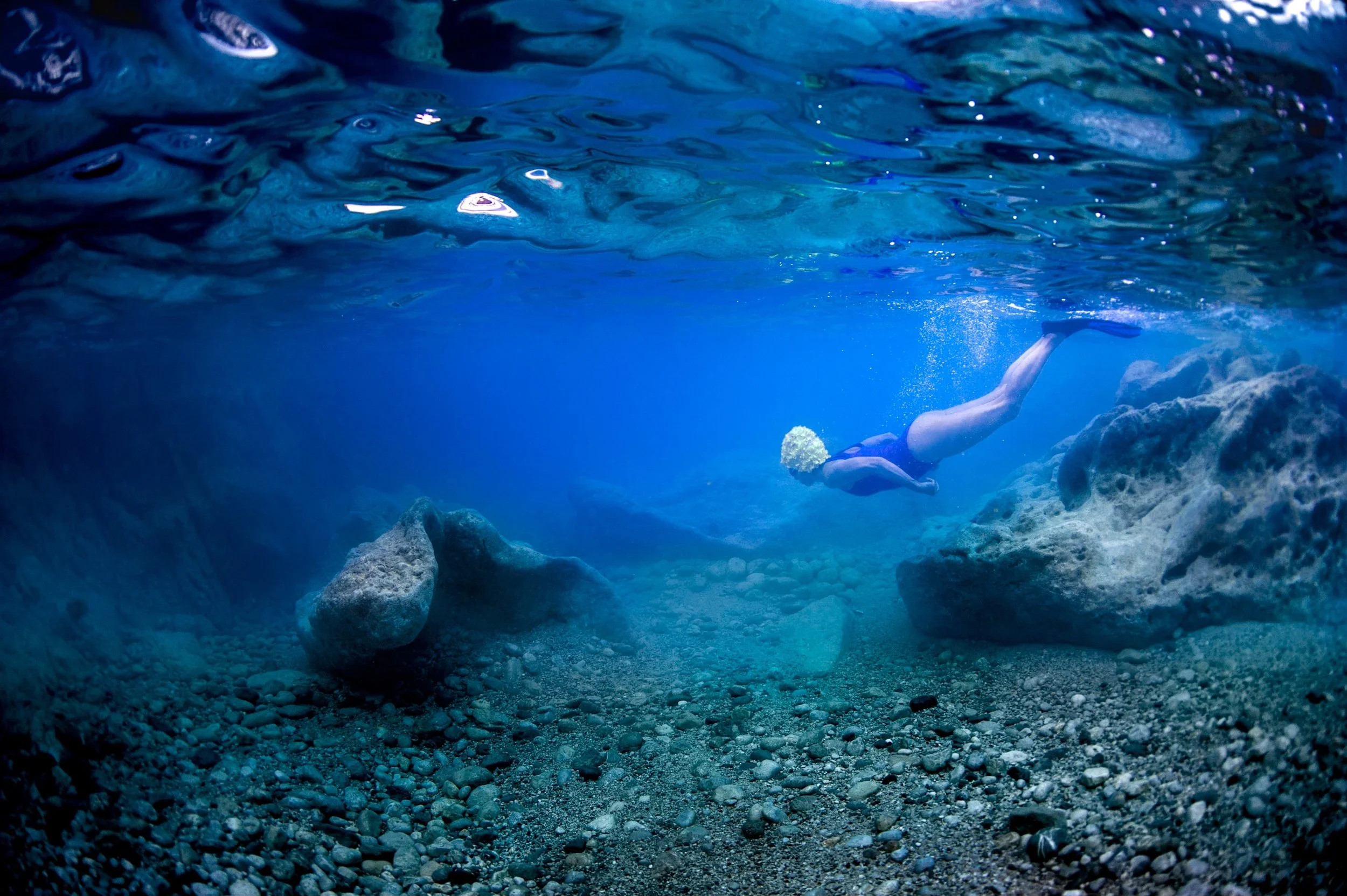 Komplementærfarger er alltid stas! Når modellen har en blå drakt på lur og forholdene ligger godt til rette, ja da er livet godt å leve. Det hører med til historien at fotografen måtte ta av seg blybelte og en pose med stein for å klare å komme opp igjen. Det gjelder altså å være sta, stå på bunnen, holde pusten lenge for å vente på den ivrige dykkerkona og til slutt komme seg opp igjen. Det må en del dykk til for å få komposisjonen der den skal være.