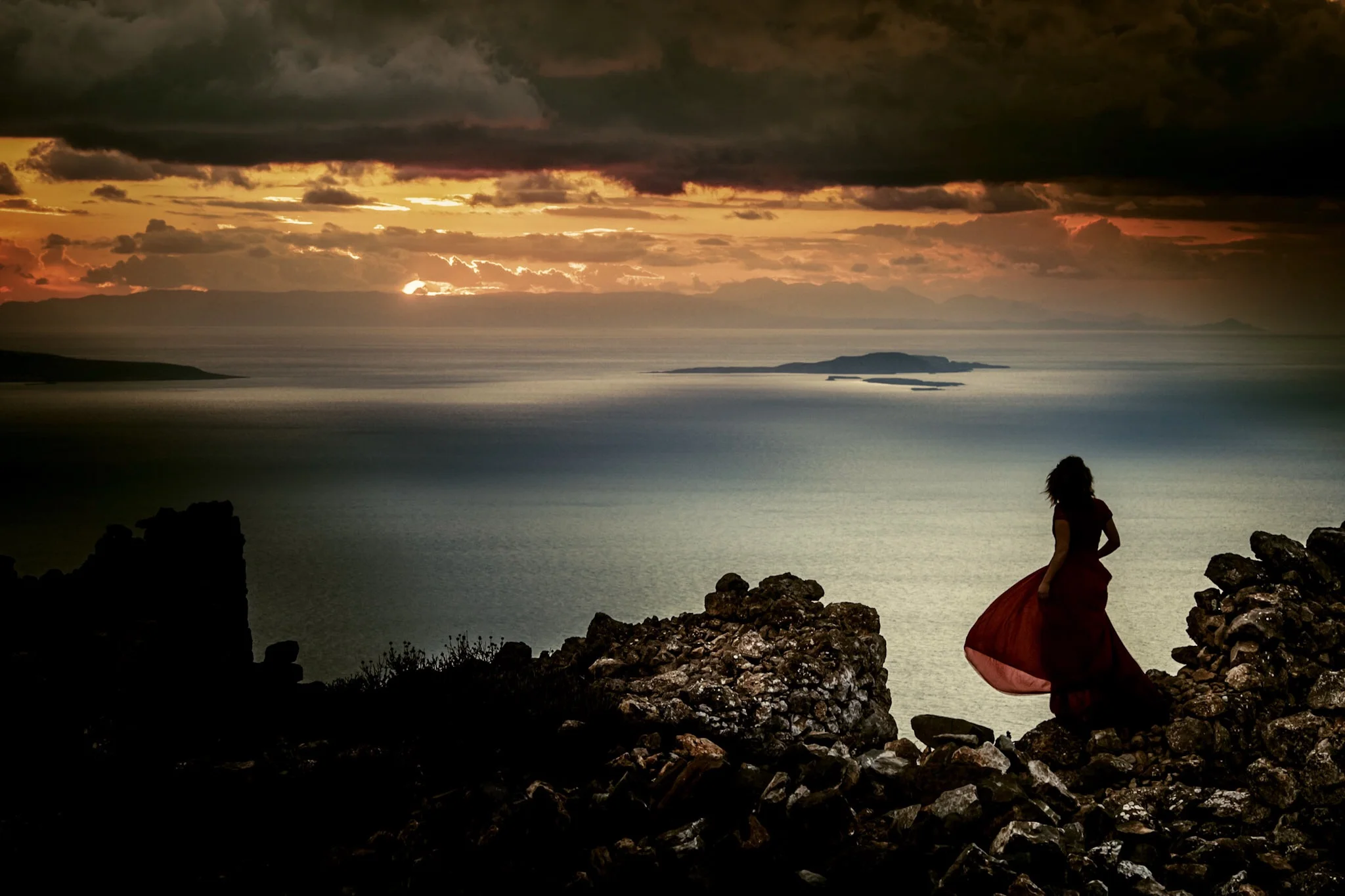 Når solen går ned er det tre valg, enten ta bilder mot den vakre solnedgangen, bruke lyset andre veien eller ha en plan og rekke begge deler. Her kommer bildet som er tatt med den vakre solnedgangen i ryggen, det andre kommer ved en senere anledning. Jeg leker ofte med lange lukkertider, dette bildet har ikke vært innom Photoshop i det hele tatt, det er mye morsommere å skape bildet i opptaksøyeblikket. Det er også utrolig spennende å komme hjem og se på fangsten på skjermen, det er små marginer for om bildene blir brukbare eller ikke. Dette bildet er tatt for få dager siden på drømmeøya Karpathos, det er som et stort studio med uante muligheter. Modell: den samme kona som er med på mange av de fotografiske eventyrene. 1/4sec, f 11, iso 200, 16mm 14-24 mm, 2,8)