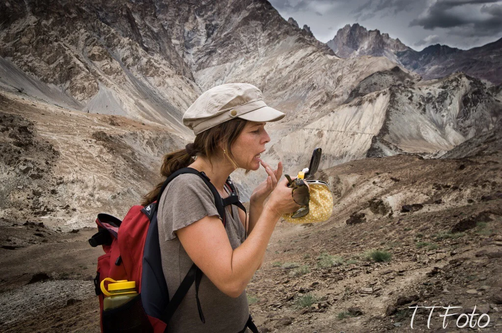 På tide å vise litt mere av den sportslige delen av kona mi. Her er vi på farten til en 6 dagers trekkingtur over fjellet i Ladakh. Vi startet først bilturen fra Leh, hvor vi hadde vært noen dager for å bli vant til høyden. Men kona ble meget syk mot toppen på 5700 meter. Men Ladakh må være et av verdens vakreste områder, med utrolige fargerike fjellformasjoner som tok helt pusten fra en ivrig fotograf. i morgen skal hun over en frådende elv i en ganske hjemmesnekret kasse.