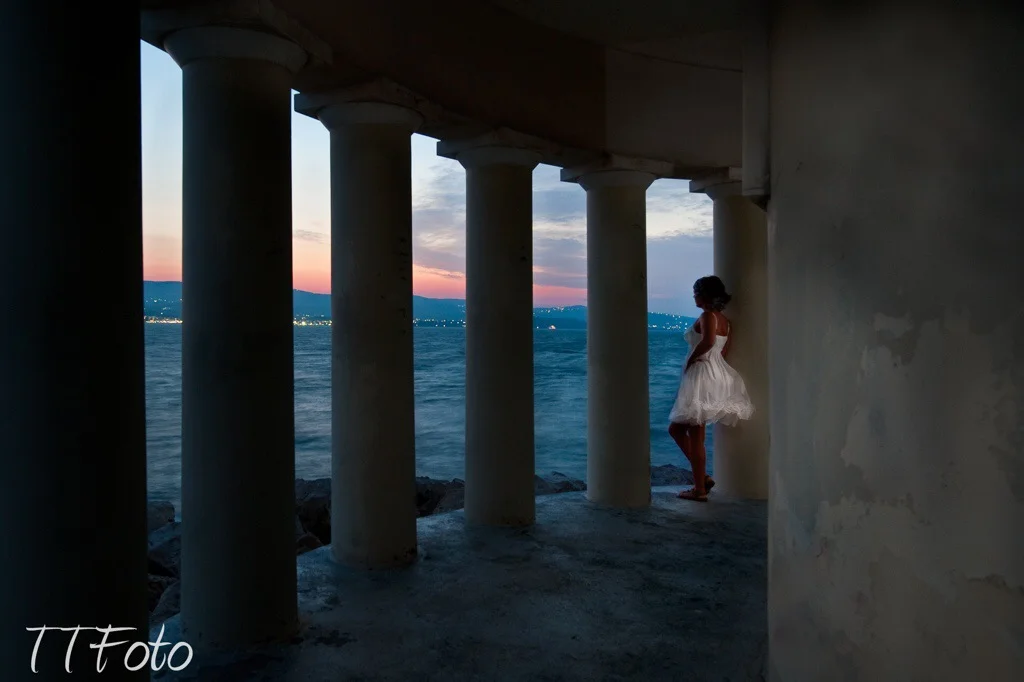 Livet handler noen ganger om flaks! Her har jeg lang lukkertid og en ung gutt står bak veggen og tar bilde av kjæresten sin med blits. Den blinker nøyaktig mens min lukker er oppe, og jeg får en akkurat passe dose lys fra den kanten på min modell. En vakker kveldsstund på den greske øya Kefalonia.