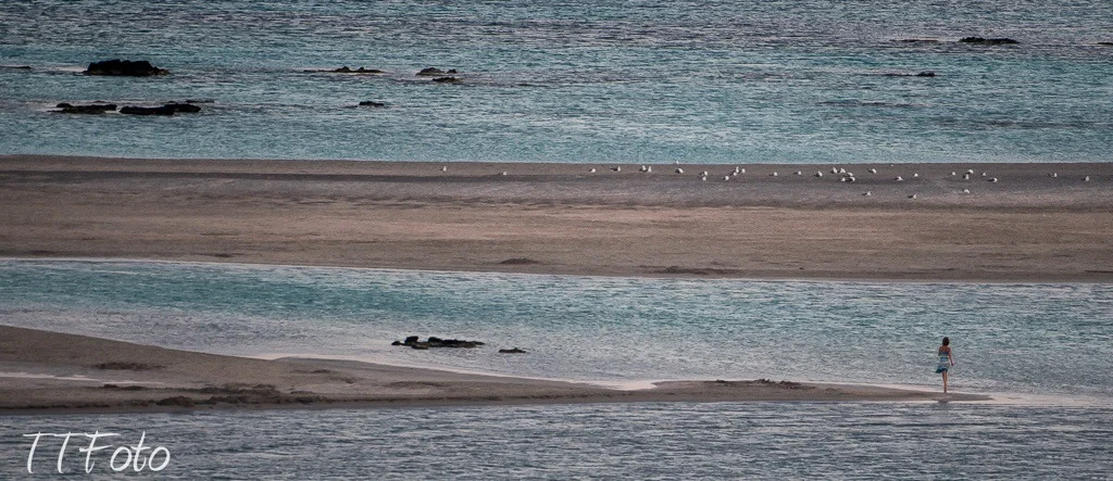 En fantastisk Strand i forrige uke, med sandbanker ut mot havet. På dagen er det dårlig lys for slike bilder og tusenvis av turister. Rett til venstre for det som sees på bildet er det ca 500 solsenger og parasoller, og da er det bare å vente til solen glir ned i horisonten. 400 mm på en topp langt fra, og kommunikasjon med mobiltelefon om hvor modellen skulle bevege seg. Kjolen matcher fargene og stripene i vannet så planleggingen er ofte mye av bildet. Kreta er stort og langt å kjøre, derfor ble det til å leie seg inn på et lite hotell for å få med seg morgenlyset dagen etter. Det kommer i morgen. For de spesielt interesserte er linsen en Nikon 200-400 f 4, stor og tung som ekstrabagasje i egen koffert på flyet.