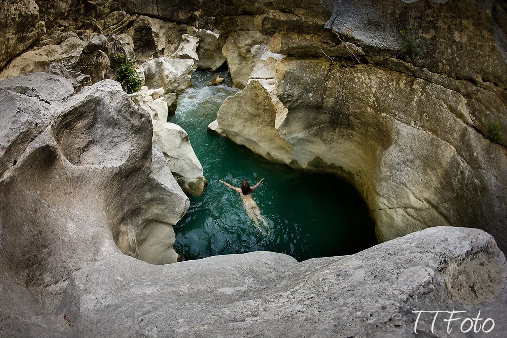 Brist i et par ribben var prisen for å få tatt dette bildet. Noen ganger må man simpelthen satse og gi full gass for å finne rette standpunktet. Bildet er tatt etter et par timers gange oppover elven, og plutselig blir det lønn for strevet. Jeg er svak for kontrasten mellom menneske og natur, eller menneske i naturen er vel et bedre uttrykk. Parga i Hellas er et fint sted med mange spennende steder i området rundt.