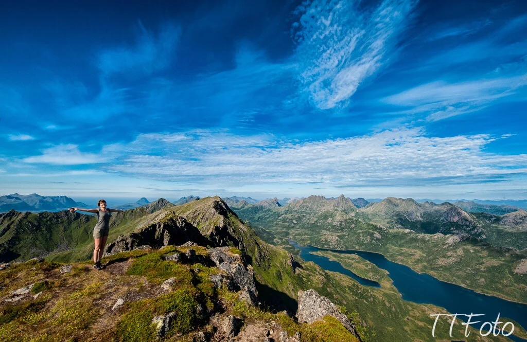 Fortsatt i Nordnorge, nærmere bestemt Vesterålen. Skulle nok gjerne hatt modellen mere mot himmelen, men da måtte jeg ligget ned og utsikten hadde ikke blitt så spektakulær. Ofte noen kameler som må svelges, ikke alltid lett å få i både pose og sekk. En utsikt blir i hvertfall som regel best med en forgrunn, et interessepunkt. Jeg har kjørt opp kontraster og "skrudd" litt på bildet for å få det slik jeg husker det. En lang, fantastisk gåtur til toppen, men absolutt verdt det når panoramautsikten åpenbarer seg.