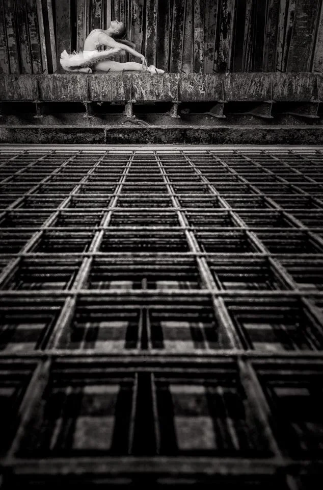 Dette er bilde to av tre på den samme betongplattingen. Det kan gjøres mye med et litt annet standpunkt, en annen brennvidde og et annet utsnitt. Her blir ballerinaen en del av miljøet på en annen måte, og det skapes en dybde ved å ha armeringsjernet i forgrunnen. Det blir også et enklere uttrykk ved å konvertere til svart hvitt. Det er faktisk blender 4, altså ikke alltid alltid nødvendig å ha forgrunnen helt skarp.