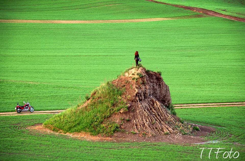 Jeg ventet lenge på at jordene rundt haugen skulle såes og få litt spenstige farger. Det passet bra da kona hadde tatt MC lappen og kjørte selv. Da er det morsomt å bygge opp et bilde med en komposisjon som føles behagelig. Det var i mine øyne genialt (les: flaks) med veiene rundt som bryter de store flatene på jordet. Det skjer noe flere steder i bildet og særlig oppe til høyre som var litt viktig da selve historien er i midten og nede til venstre. Hun gikk opp og ned og sto litt på toppen, og det var det jeg likte best. Det skapte den roen og harmonien jeg var på jakt etter.