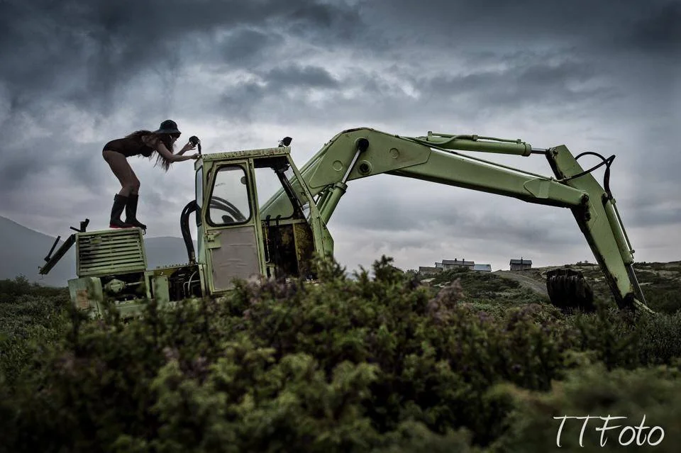Når vi overnatter på Dovrefjell med campingvogn blir det til å gå tur. Jeg ser alltid firkanter og tenker foto hele tiden, det er nok en slags besettelse. Jeg falt for gravemaskinen, som en gammel og sliten formfull kontrast i naturen. Ikke vakkert i seg selv men greit å prøve å gjøre det beste ut av situasjonen. Jeg spør om kona kan tenke seg å klatre litt rundt på denne i duskregnet. Det er en betingelse; Hun skal bestemme hva antrekket skal være. Først tenker jeg at det går på æren løs for en ivrig fotograf at han ikke har hele regien, men sender de dumme tankene vekk og blir veldig nysgjerrig. Bildet taler for seg, og for den som ser på bildet på noe større enn en telefon er det røde såler på gummistøvlene.