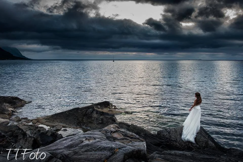 Fortsatt med leid campingvogn på slep, det er viktig å overnatte der motivene er og ikke der noen andre har bestemt at det skal være et hotell eller en campingplass. Jeg ventet nok et par timer på at lyset og himmelen skulle bli slik som på bildet, og heldigvis skifter lyset fort og ventingen betaler seg. Jeg tenker noen ganger i ettertid på hvordan bildet bør kroppes, selv om jeg har litt trening med å komponere i utløserøyeblikket. Man har da fotografert med dias i en halv mannsalder! Her var valgets kval om himmelen burde beskjæres ned til rett under den store lyse åpningen i skyene. Etter en lang filosofering og prøving frem og tilbake endte jeg opp med å beholde bildet som det var tatt. Igjen handler det om følelser, og jeg tenkte at det ble en slags gjentagelse av den lyse kjolen og hele bildet ble mere “åpent” og vennlig. Du som leser dette kan gjerne holde over øverste del og se at bildet da bli mere dramatisk og litt mere dystert. Heldigvis er det alltid veldig mange meninger om bilder og det gjør det veldig spennede.