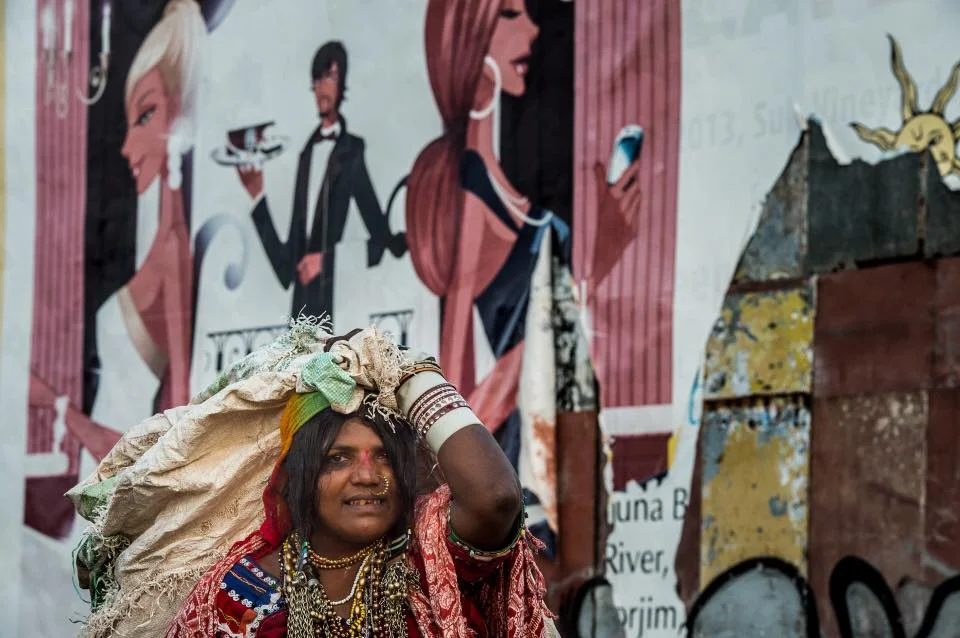 Fotografen jakter også på kontrastene! Verden er full av det, det gjelder bare å sette hjernen i rett modus. Jeg reiser gjerne litt vekk fra der turistene ferdes, da oppnås gjerne de beste motivene, men dette er i et område med mye mennesker. Denne kvinnen i Goa i India lever av å samle flasker, og syntes det var helt greit å bli fotografert. Det var valgets kval om bildet bør være kvadratisk, uten det avrevne papiret på høyre side, men det viser forfallet dobbelt opp og skaper gjentagelse av farger og forsterker komposisjonen. I morgen kommer det et bilde hvor fotografen går tettere på og selve ansiktet blir det essensielle.